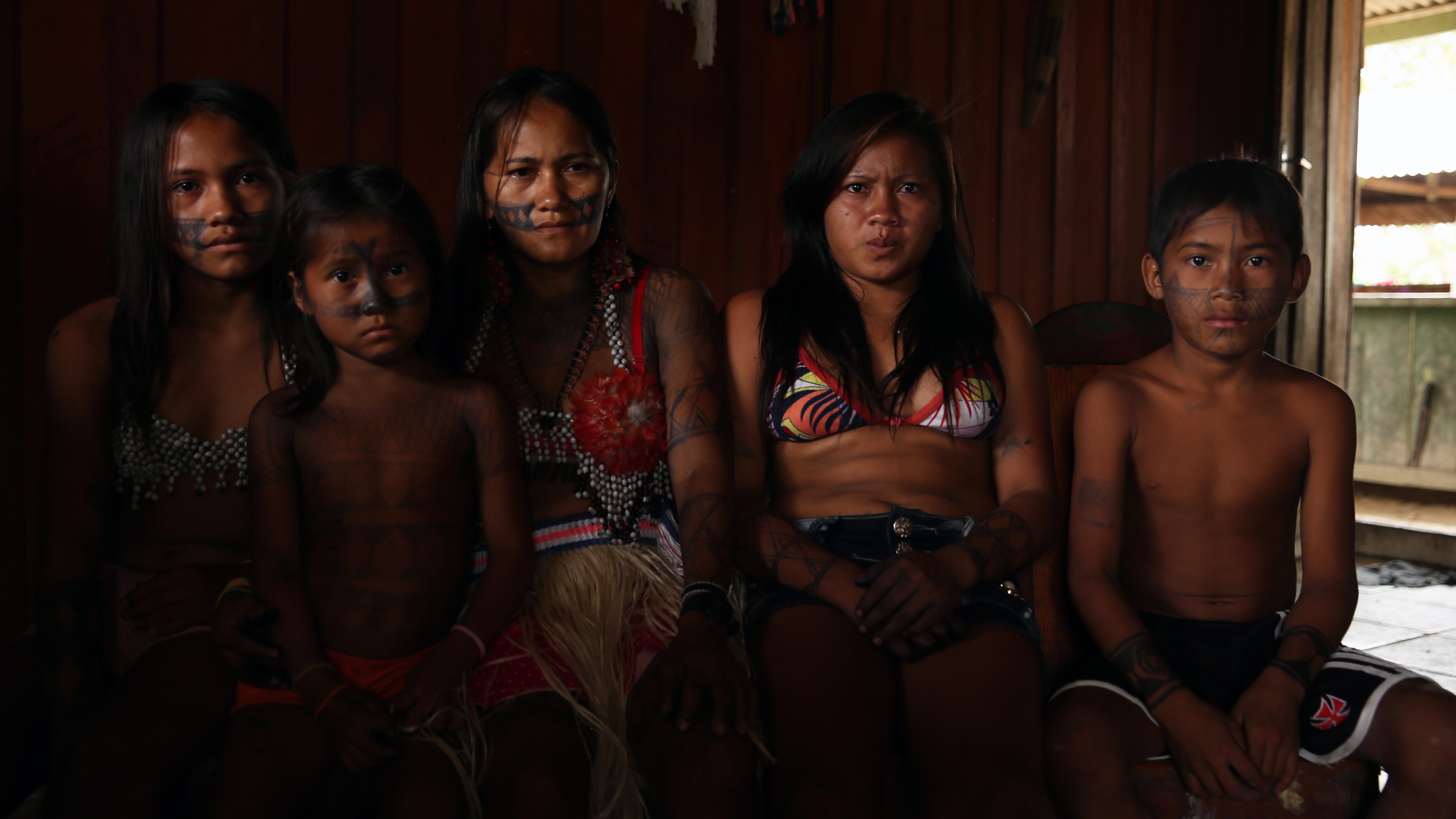 Ivete Saw (ao centro). Hoje ela depende da ajuda de outras famílias da aldeia para sustentar os quatro filhos que teve com Adenilson.