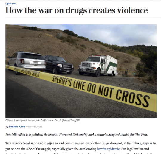 Em 2015, Danielle Allen, uma cientista política da Universidade de Harvard, escreveu um artigo de opinião no Washington Post com o título “Como a guerra às drogas cria a violência”. Nesse artigo, ela explica que uma das razões fundamentais para “descriminalizar as drogas decorre de como a guerra às drogas fomenta os crimes violentos, o que por sua vez leva ao encarceramento e gera outros resultados sociais negativos”. Como ela comparou: “Não é possível mover o equivalente a cem bilhões de dólares de um produto ilegal sem um bom tanto de agressões e homicídios. Não é algo que deveria ser difícil de explicar ou entender.”