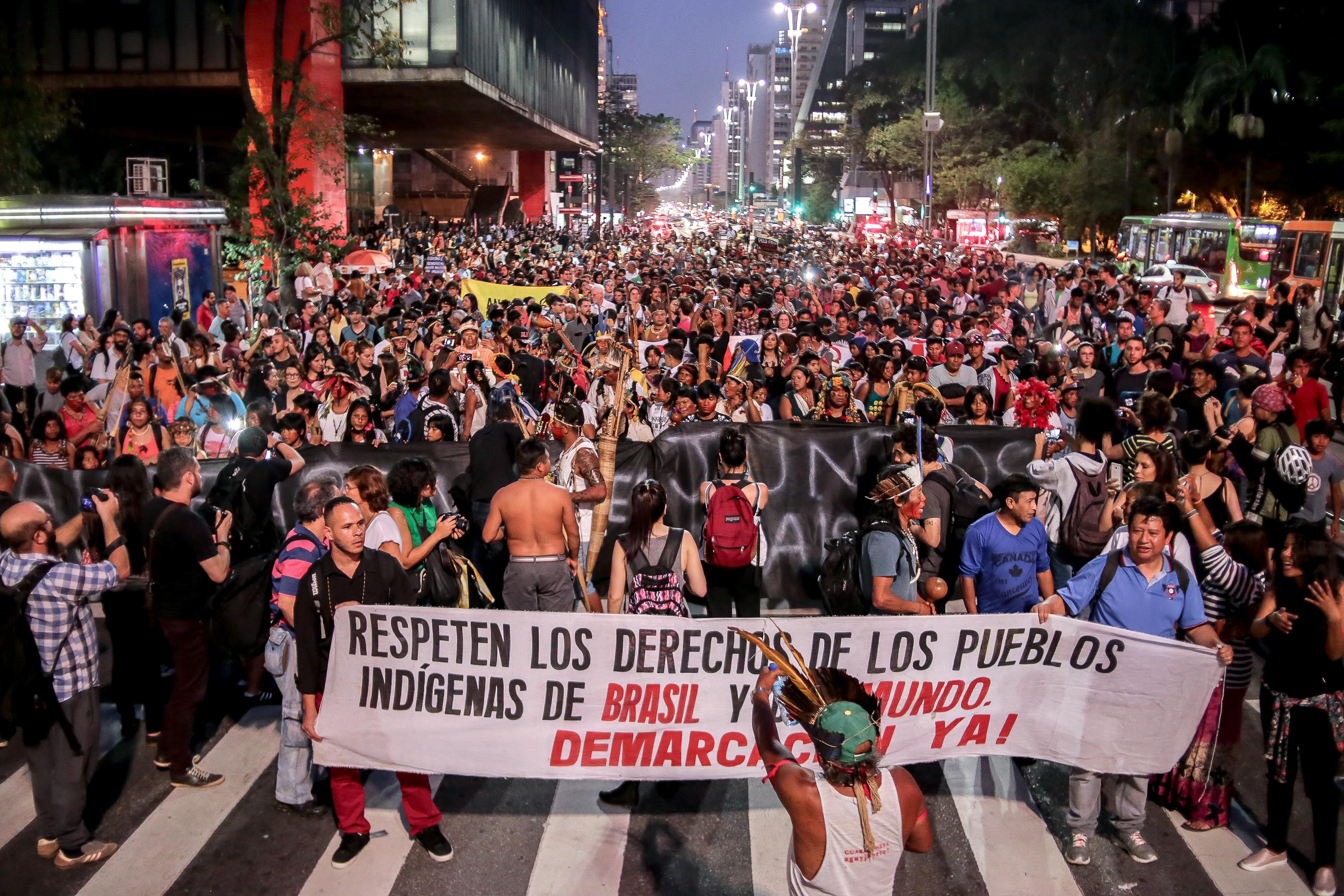 Índios da tribo Guarani realizam manifestação na Avenida Paulista, região central de São Paulo, em defesa da demarcação de terras indígenas (30/08/17).