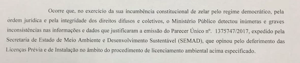 O Ministério Público Estadual também emitiu um ofício em que pede a retirada do processo de licenciamento, por apontar falhas no parecer da secretaria estadual.