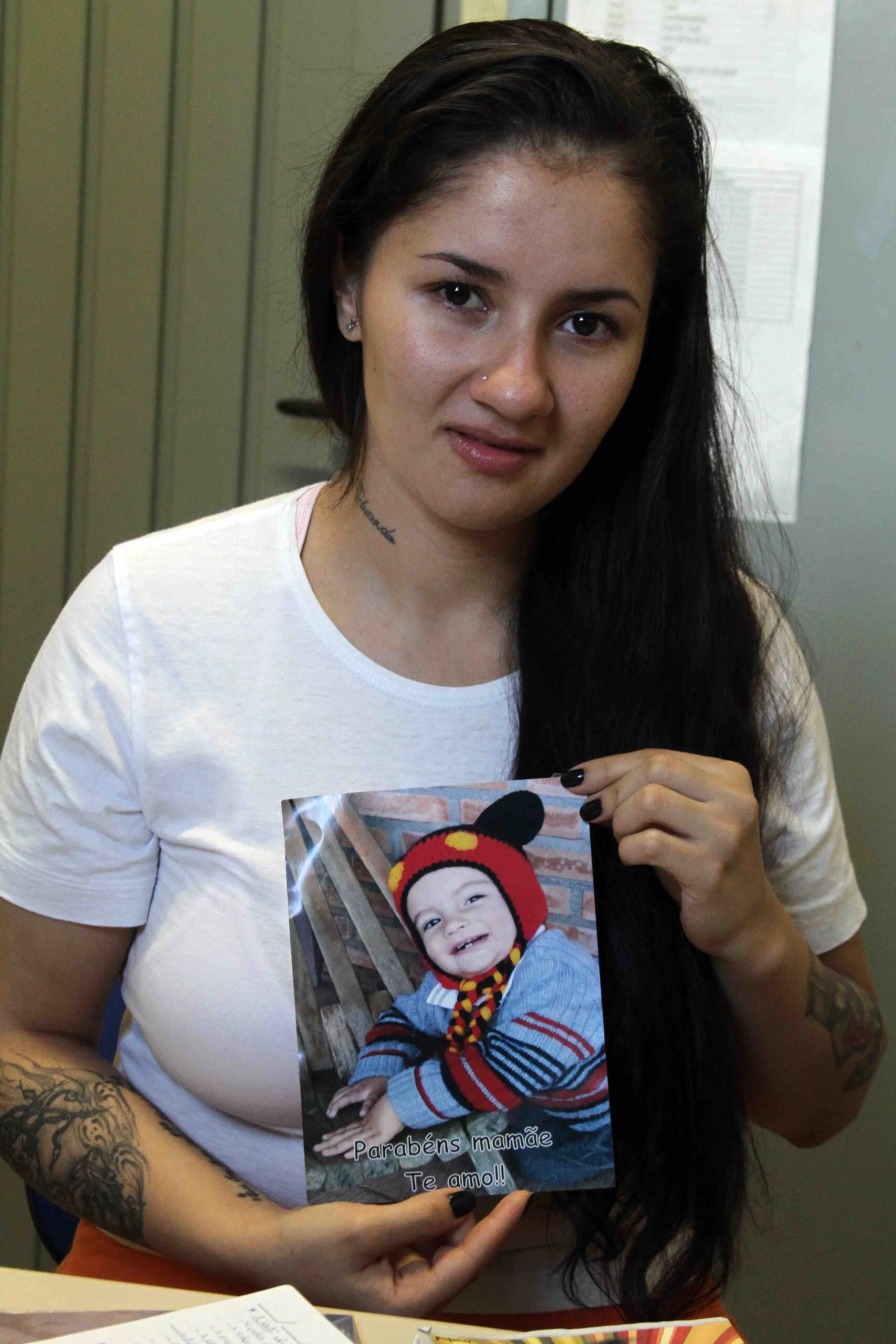 Natacha mostra uma foto que recebeu de seu bebê na cadeia.