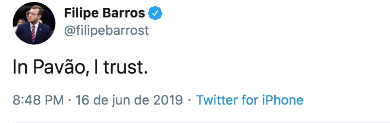 O bolsonarista fiel Filipe Barros (PSL) negou todas as acusações de Hasselmann e a atacou vazando um áudio privado em que ela chama as tretas do PSL de “putaria” e diz estar de “saco cheio desse bando de filho da puta (do PSL)”. Barros também foi um dos que amplificou o perfil Pavão Misterioso.