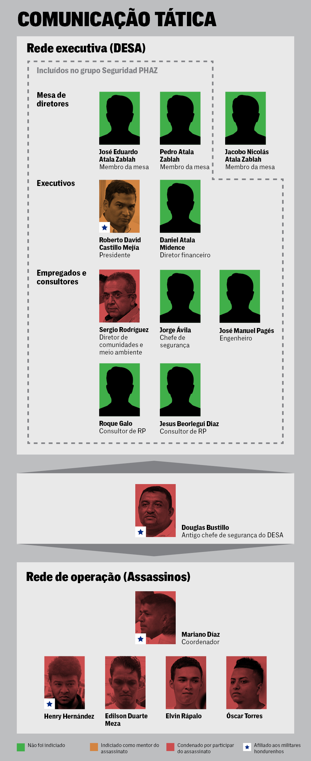 A DESA também estava partindo para a ação naquele ano. Desde pelo menos março de 2015, Douglas Bustillo, chefe de segurança da DESA e ex-tenente do exército hondurenho, vinha se comunicando com um líder de inteligência do exército, Mariano Díaz. Ambos foram condenados, três anos depois, por ajudar a coordenar o assassinato de Cáceres.
