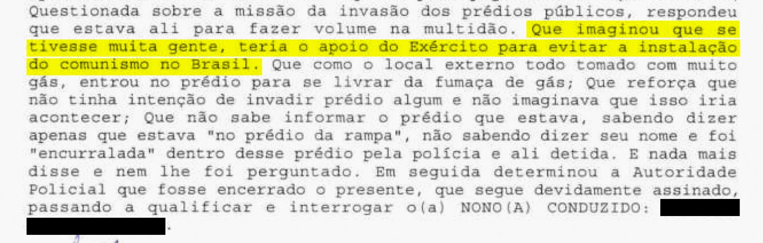 Outros depoimentos relataram a mesma devoção dos golpistas aos militares e o mesmo apoio do Exército. “O Exército já estava lá dentro deixando as pessoas com a sensação de estarem seguras”, informou o paulista D.S.N, de Carapicuíba. Já G.A.D, de Ipora, em Goiás, “ficou abaixada no pé do pessoal do Exército até ser presa pela Polícia Militar que entrou no ambiente”.