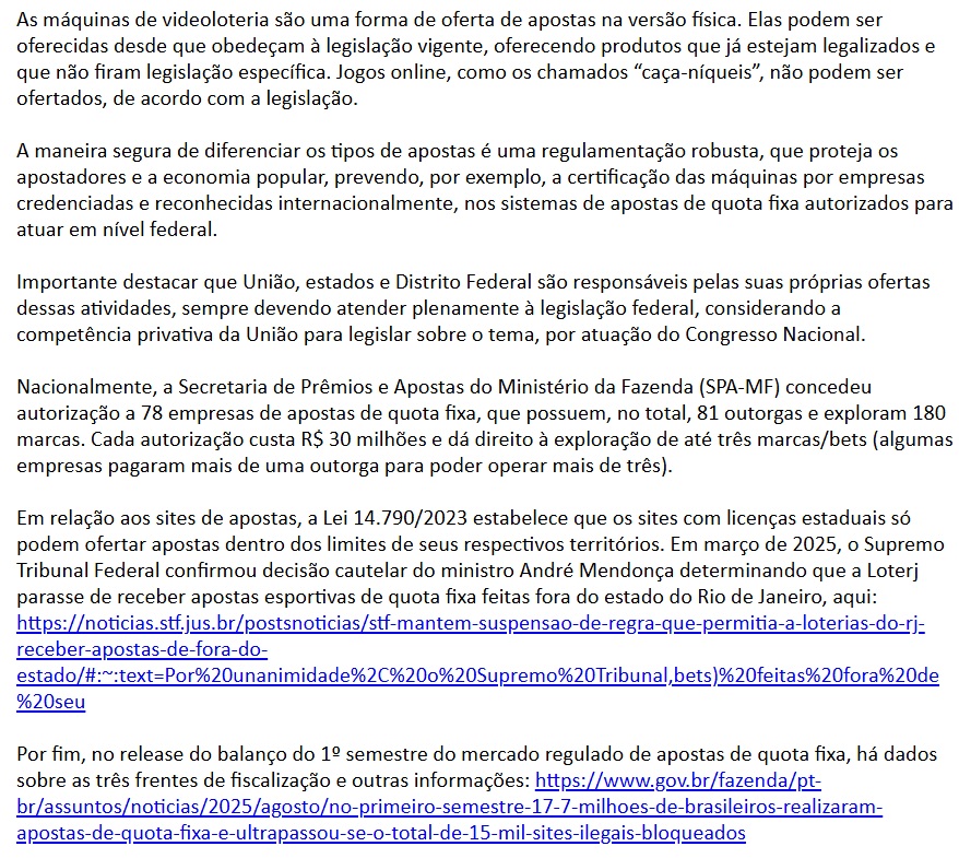 Conforme o ministério, essas máquinas de VLTs “podem ser oferecidas desde que obedeçam à legislação vigente, oferecendo produtos que já estejam legalizados e que não firam legislação específica”. A pasta ainda afirmou que “jogos online, como os chamados ‘caça-níqueis’, não podem ser ofertados, de acordo com a legislação”.