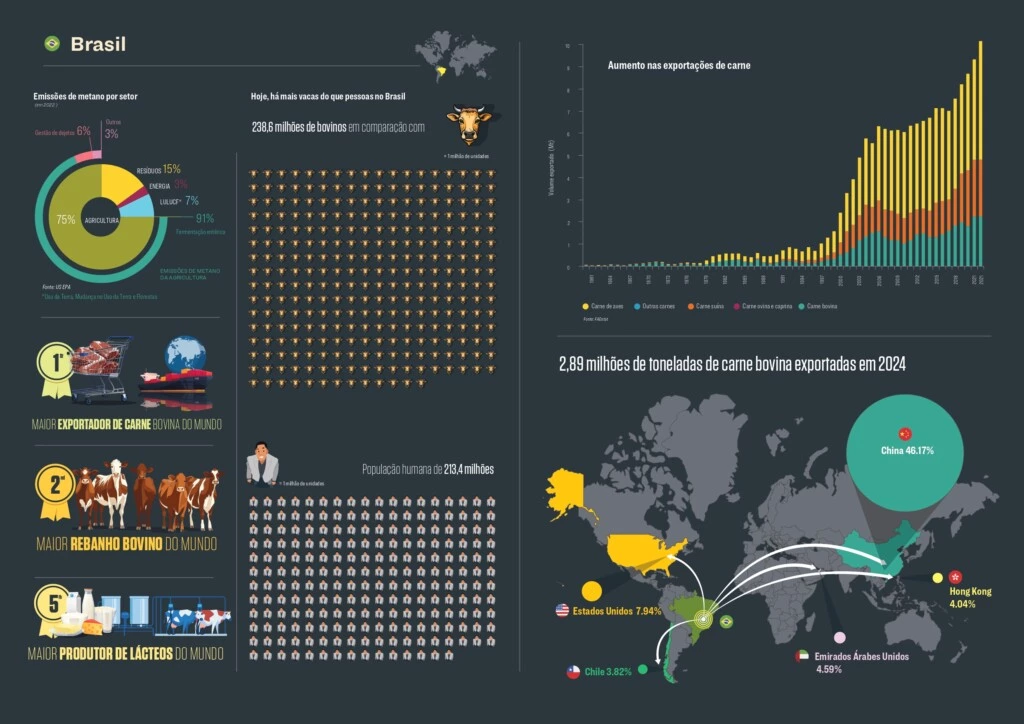 Atualmente, o agronegócio responde por até três quartos das emissões de metano, um dos principais gases do efeito estufa, no país, sendo o rebanho bovino o maior causador da liberação desse gás pelo Brasil, segundo o Observatório do Clima. O país tem o segundo maior rebanho bovino do mundo e lidera as exportações de carne global.