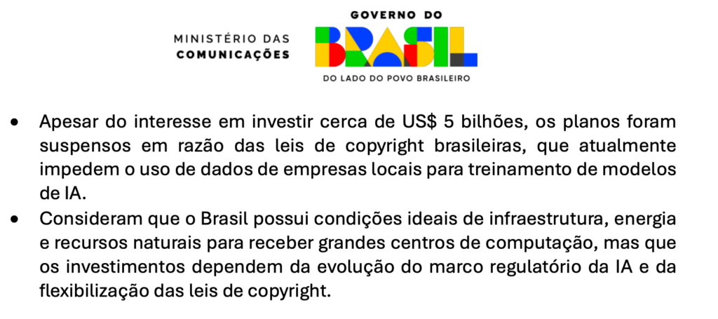 Segundo a ata da reunião, os representantes da OpenAI, incluindo Benjamin Schwartz, diretor global de parcerias e políticas de infraestrutura, disseram aos servidores do governo, dentre eles o ministro de Comunicações, Frederico Siqueira, que a empresa considera que “o Brasil possui condições ideais de infraestrutura, energia e recursos naturais para receber grandes centros de computação, mas que os investimentos dependem da evolução do marco regulatório de IA e da flexibilização das leis de copyright”.