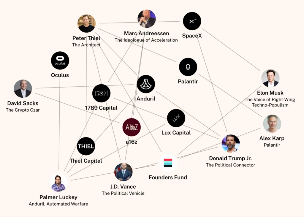 Investidores e ideólogos como Thiel, Elon Musk, Marc Andreessen, David Sacks, Palmer Luckey e Alexander Karp promovem uma agenda que normaliza a externalização da soberania estatal para infraestrutura privada, justificando-a como modernização e eficiência em defesa e governança.