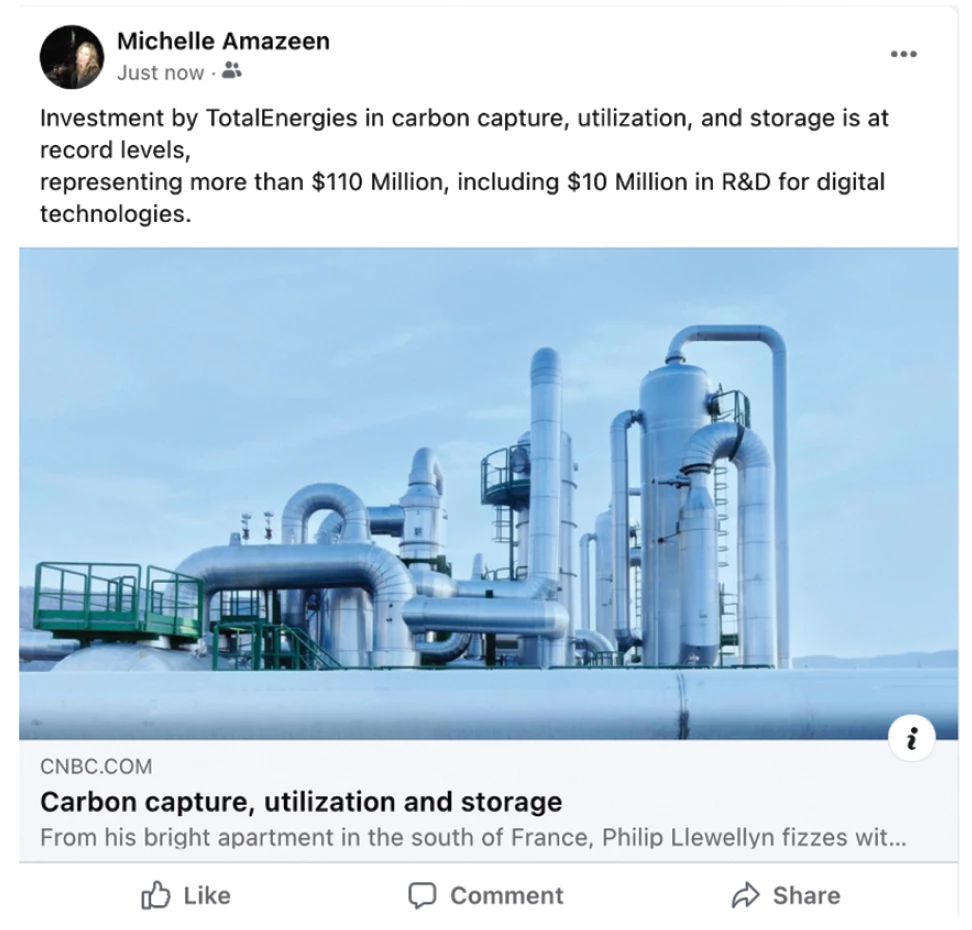 Captura de tela de um anúncio nativo da TotalEnergies na emissora CNBC, que foi compartilhado no Facebook como parte da pesquisa de Amazeen, em 26 de janeiro de 2023.