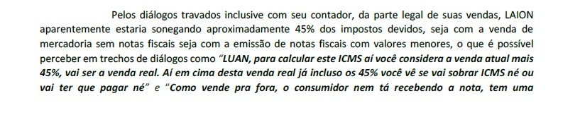 Ele ainda diz que despachava as bebidas de Jandaia do Sul, no Paraná, onde a fiscalização seria menos rigorosa do que outras cidades mais próximas da fronteira. A Polícia Federal do Paraná avaliou na investigação que Laion estaria sonegando aproximadamente 45% de impostos devidos.