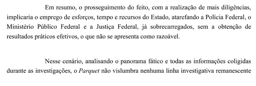 O procurador ainda afirmou que a realização de mais diligências “implicaria o emprego de esforços, tempo e recursos do Estado, atarefando a Polícia Federal, o Ministério Público Federal e a Justiça Federal, já sobrecarregados, sem a obtenção de resultados práticos efetivos”.