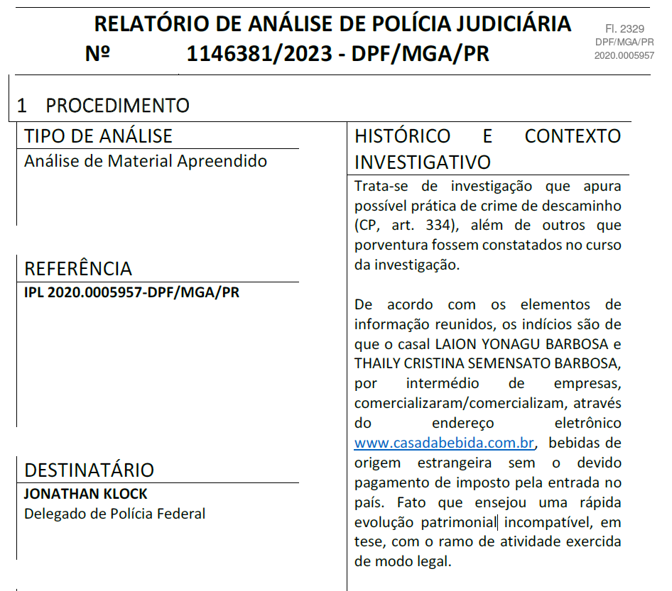 Relatório da Polícia Federal de março de 2023 analisou que a comercialização de bebida estrangeira sem pagamento de imposto pela entrada no país provocou uma “rápida evolução patrimonial” do casal, “incompatível, em tese, com o ramo de atividade exercida de modo legal”.