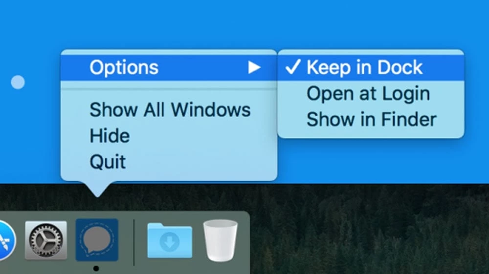 Talvez você queria facilitar seu acesso ao Signal Desktop. Para os usuários de Mac, basta fazer um clique secundário (com a tecla “Control” pressionada) no ícone do Signal no Dock , selecionar “Opções” e marcar a opção “Manter no Dock”. No Windows, clique com o botão direito do mouse no ícone do Signal na barra de tarefas e selecione “Fixar na barra de tarefas”.