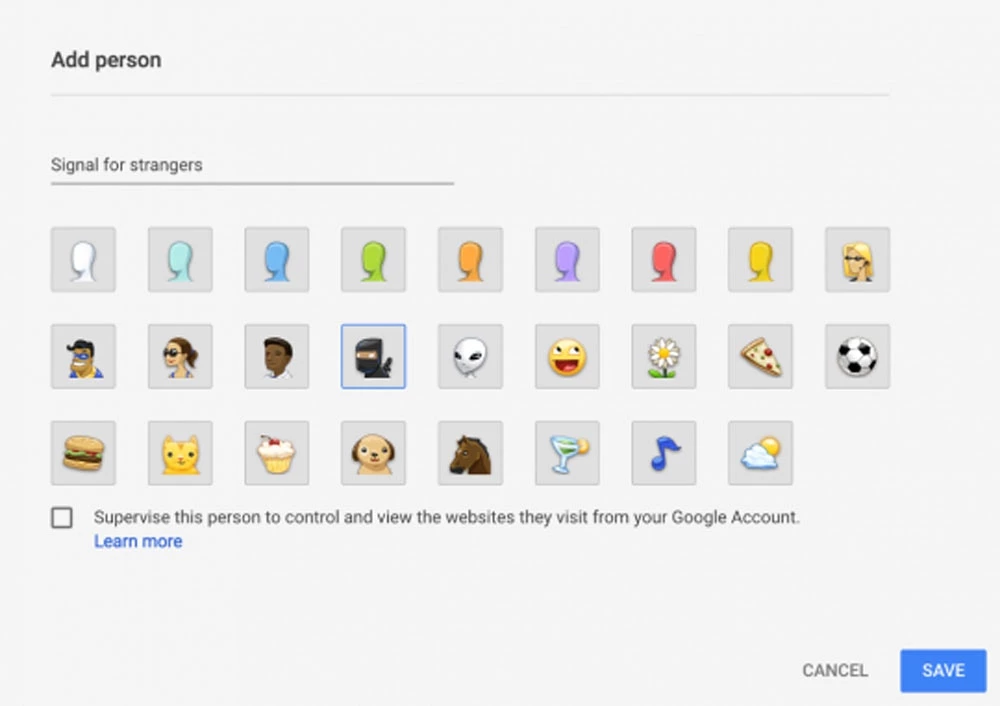 No canto inferior direito, clique em “Adicionar pessoa”. Crie um nome e selecione um ícone para o novo perfil. Na imagem abaixo, escolhi o nome “Signal para desconhecidos” e o ícone de um ninja.