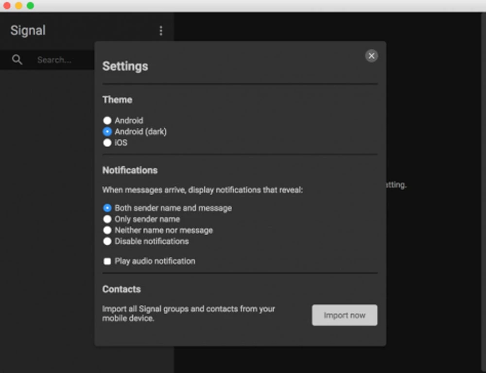 Por fim, uma dica para quem usa mais de um Signal Desktop no mesmo computador: clique no ícone de três pontos do Signal Desktop e selecione “Configurações”. Isso permite que você escolha entre três temas visuais diferentes. Atribua temas diferentes para cada versão do Signal Desktop para ajudar a distinguir uma da outra.