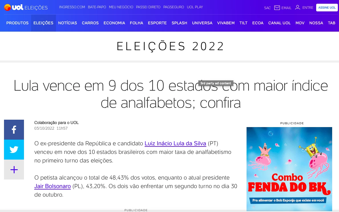 Matérias do UOL e da CNN com o título “Lula venceu em 9 dos 10 estados com maior índice de alfabetos”.