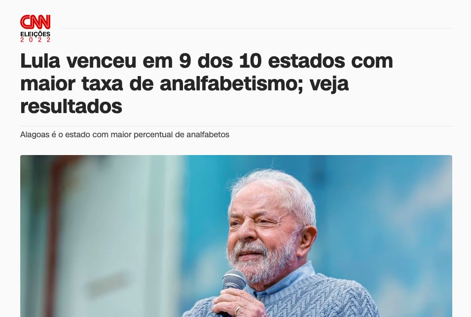 O UOL e a CNN, além dos outros veículos que reproduziram a correlação enganosa, se utilizam de uma falácia que serve há tempos para parte da imprensa disseminar um conteúdo tão mentiroso e tóxico quanto o do presidente: ele combina a ideia de “voto errado” e falta de letramento formal (ou melhor, “voto errado”, falta de letramento formal e Lula). Porém, enquanto o marido de Michelle arreganha os dentes, jornais, sites e televisões investem na performance da democracia: primeiro, fazendo correlações estatísticas frouxas e racializadas; depois, noticiando a xenofobia do incumbente como se não fossem companheiros dos ataques.