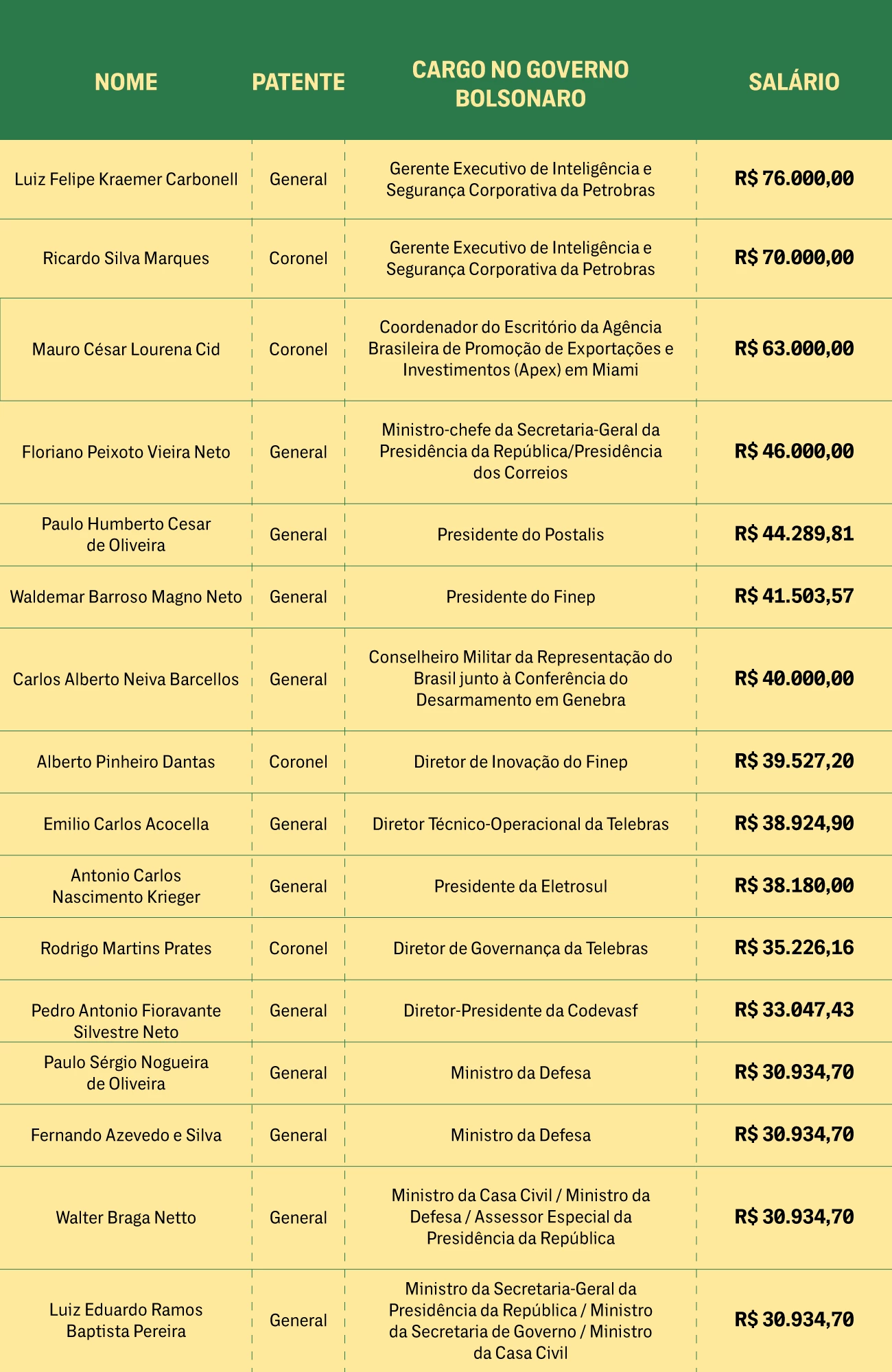 No levantamento feito pelo Intercept, tomando como base os salários que constam no Portal da Transparência, além de normas e relatórios sobre remuneração de empresas e entidades ligadas ao governo, os rendimentos médios da turma da Aman variavam. Começavam entre R$ 10 mil, como o do coronel da turma de 1976, Diógenes Dantas Filho, que estava no Conselho Administração Transpetro, a até R$ 76 mil reais – valor que recebia o general Luiz Felipe Kraemer Carbonell, da turma de 1977, que assumiu como diretor em Itaipu.